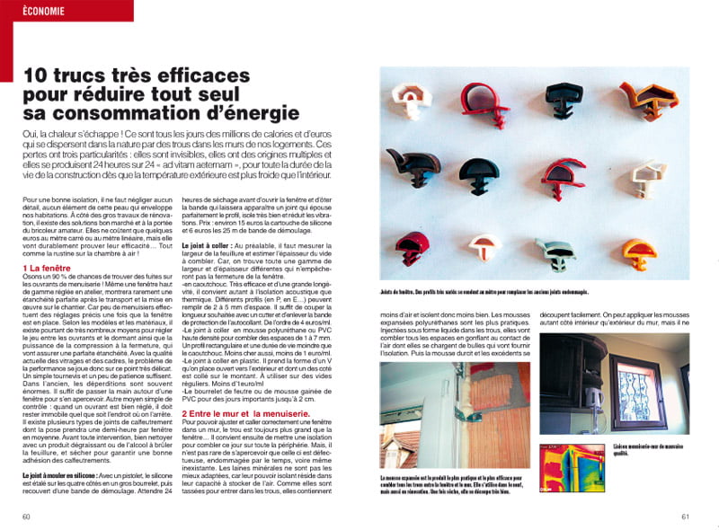 Sur la route dʼun bâti économe, autonomie énergétique totale et joint de fenêtre se rejoignent. Si toute maison sera positive en énergie avec la RT 2020, lʼoption maison + voiture électrique montre une voie très intéressante, à lʼétat de projet en France, mais de prototypes en test dans dʼautres pays. Enfin, parce quʼune fuite thermique agit 24 H sur 24, pour toute la vie, chacun peut poser les rustines qui y mettront un terme définitif. Investir quelques euros et quelques heures de bricolage malin dans lʼisolation sera, à nʼen pas douter, le meilleur placement financier de lʼannée 2011 !
