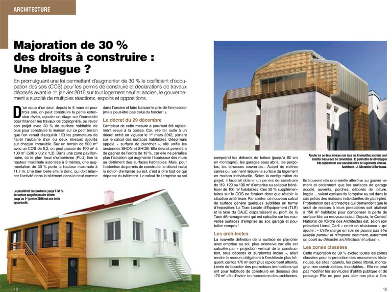 Depuis le 6 mars et pour les trois prochaines années, le Coefficient d’Occupation des Sols est augmenté de 30 %. Des projets de surface habitable bien plus grands sur les mêmes parcelles, des possibilités d’extensions en largeur et en hauteur ouvertes à toutes les constructions anciennes… Cette mesure gouvernementale semblerait promise à un beau succès et devrait relancer fortement la construction si elle augmentait de près d’un tiers la surface du bâti existant ! Mais ne risque t’elle pas d’être entravée par les multiples zones classées et les prérogatives des communes qui restent les ultimes décisionnaires pour la délivrance des permis de construire ?