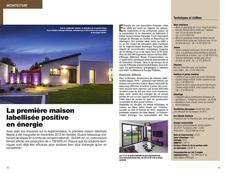 Avec sept ans d’avance sur la réglementation, la première maison labellisée Bepos a été inaugurée en novembre 2013 en Vendée. Quand beaucoup s’efforcent de respecter la limite de consommation de - 50 kWh.m2, ici, cette maison témoin affiche une production de + 122 kWh.m2. Preuve que les solutions techniques sont déjà très efficaces pour produire bien plus d’énergie qu’on en consomme !