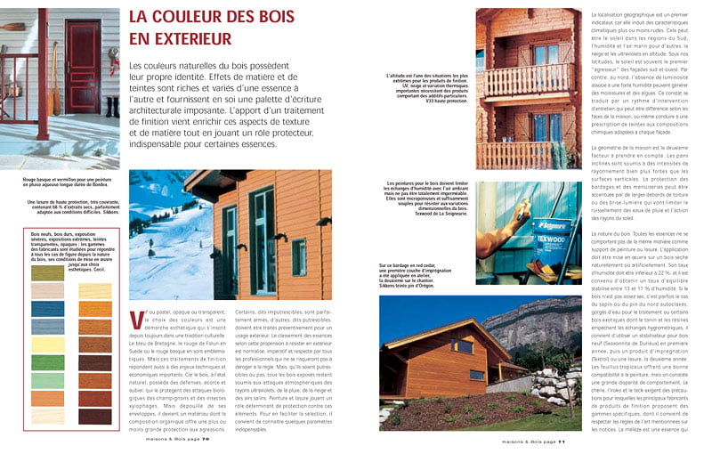 Les couleurs naturelles du bois possèdent leur propre identité. Effets de matière et de teintes sont riches et variés d’une essence à l’autre et fournissent en soi une palette d’écriture architecturale imposante. L’apport d’un traitement de finition vient enrichir ces aspects de texture et de matière tout en jouant un rôle protecteur, indispensable pour certaines essences.