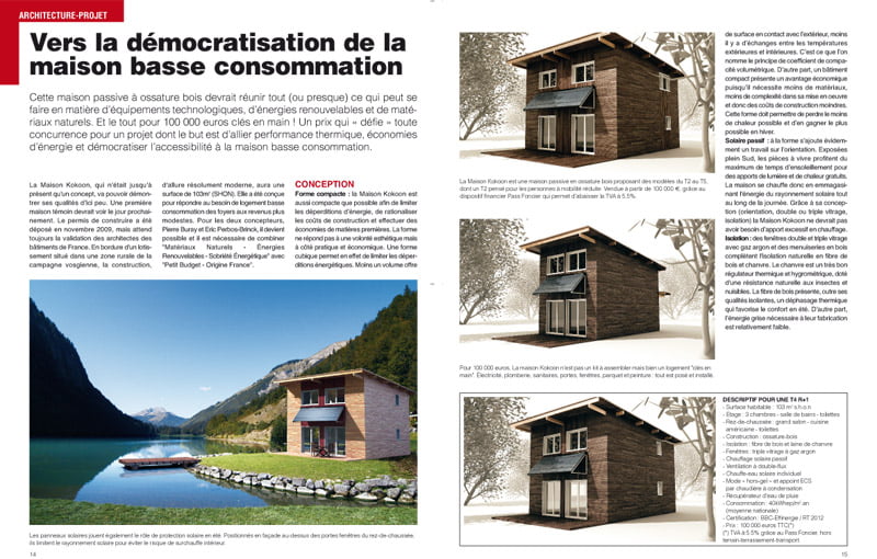 Cette maison passive à ossature bois devrait réunir tout (ou presque) ce qui peut se faire en matière d’équipements technologiques, d’énergies renouvelables et de maté- riaux naturels. Et le tout pour 100 000 euros clés en main ! Un prix qui « défie » toute concurrence pour un projet dont le but est d’allier performance thermique, économies d’énergie et démocratiser l’accessibilité à la maison basse consommation.