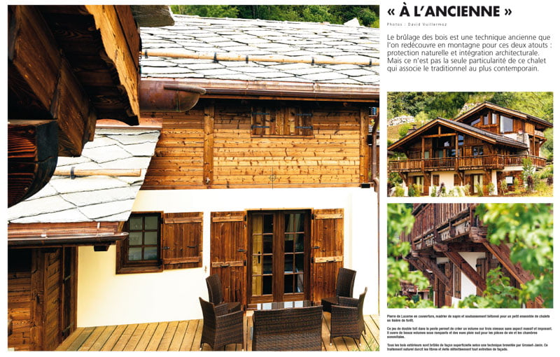 Le brûlage des bois est une technique ancienne que l’on redécouvre en montagne pour ces deux atouts : protection naturelle et intégration architecturale. Mais ce n’est pas la seule particularité de ce chalet qui associe le traditionnel au plus contemporain.