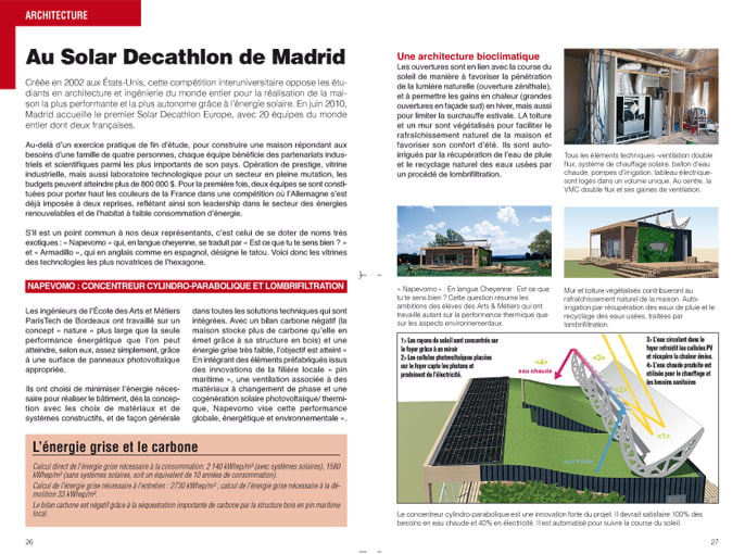 Le Solar Decathlon de Madrid en offre une belle illustration : la maison lauréate (Virginie-USA) de cette compétition universitaire se pilote à partir dʼun I-phone ! Nos deux défis français échouent près du podium. 4e place pour Armadillo, 7e pour Napevomo. Vous découvrirez dans ces pages toutes les subtilités de ces réalisations : terre cuite et lombrics côtoient le top des matériaux hightech. Pourtant, selon Didier Ridoret, le Président de la Fédération Française du Bâtiment, nous ne serions quʼau tout début dʼune fantastique évolution : « La moitié des matériaux qui seront vendus dans 5 à 7 ans nʼexistent encore pas ».
