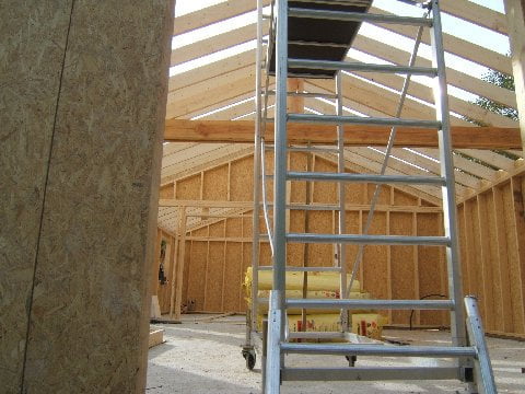 A ce prix là , c'est toi qui fournit le bois ( lisses et montants, voile osb, chevrons et pannes ) ou c'est le client? Combien de personnes sur le chantier payées par ces 25000 francs ou euros? Et puis sans engin de levage, même si c'est un plein pied c'est pas mal…