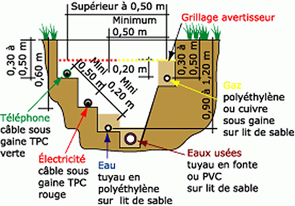 - un fourreau "de service" (sonnette portail + lumière + motorisation portail) = gaine 19 ou 25mm contenant un cable RO2V 3x2,5 et un cable signal 4 paires torsadées