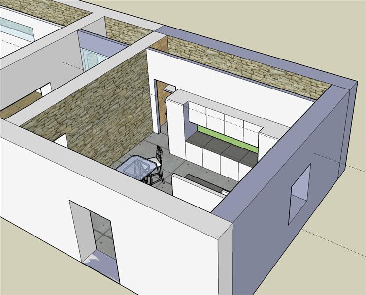Dans la pièce qui va devenir la cuisine, je souhaite créer un espace tampon au Nord qui servira de cellier. Mon idée est de construire une cloison isolante en ossature bois (le mur Nord en pierre ne sera pas isolé).