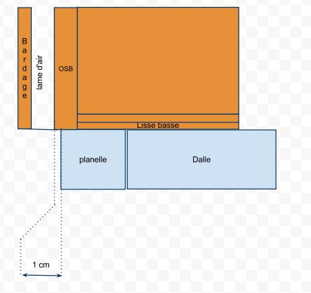 sur la plupart des schema du CNDB dalle beton de la section 2.10 .............2.50 indique bien que osb est en debord de dalle et au bas de la lisse basse qui celle-ci est d'aplomb avec le nez de dalle (planel ou pas)