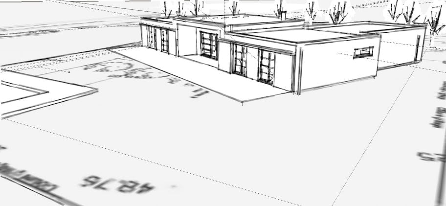 Des volets coulissants devant les baies Sud de 160, une casquette solaire de 205cm sur la baie de 480cm avec une pergola temporaire pour l'été ou des rideaux externes sous le préau.