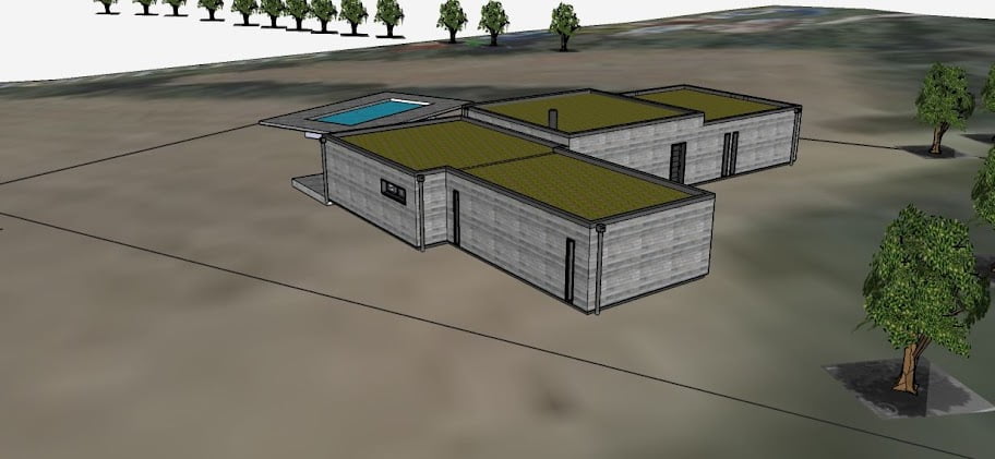 Pièces techniques au Nord (2SDB, garage et bureau), double rideau de chênes au Nord protégeant des vents froids