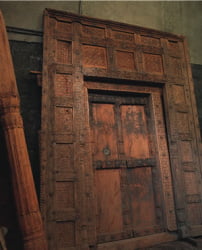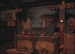Sans aucun doute les pièces les plus impressionnantes de cette caverne d’Ali Baba. Les encadrements de portes peuvent dépasser les 4 mètres. Comme beaucoup de trésors, elles viennent de temples et de maisons. Cet aspect très ouvragé récurrent, pour ne pas dire artistique, se retrouve aussi bien dans les lieux sacrés que dans les habitations plus simples. Ici cette porte avec ces battants en croix est taillée dans un résineux proche du mélèze. Sur la droite, on aperçoit à hauteur d’homme un miroir circulaire dont la signification reste inconnue. Ces encadrements trouvent leurs places comme portes de communication dans les séjours des chalets, par exemple.
