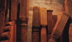 Ces colonnes remarquablement travaillées proviennent de la vallée de Swat, dans les zones tribales du Pakistan. Datant de la fin du 19 e siècle, on les trouvait dans les temples et les maisons. Taillées dans des résineux de la région, elles allient lignes droites et formes arrondies. Dans ce pays, les charpentes triangulées n’existent pas. Les toitures plates sont portées par trois ou quatre poteaux alignés au centre de la pièce. La lumière révèle toutes les nuances des différents motifs sculptés, laissant entrevoir les origines perses de ces impressionnantes pièces.