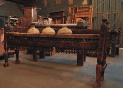Martial et Zohra multiplient les voyages pour rapporter ce splendide mobilier. Des journées de travail sont nécessaires pour rendre vie à des objets blessés par des siècles d’utilisation et réalisés avec les outils les plus rudimentaires qu’ils soient : herminettes et couteaux !